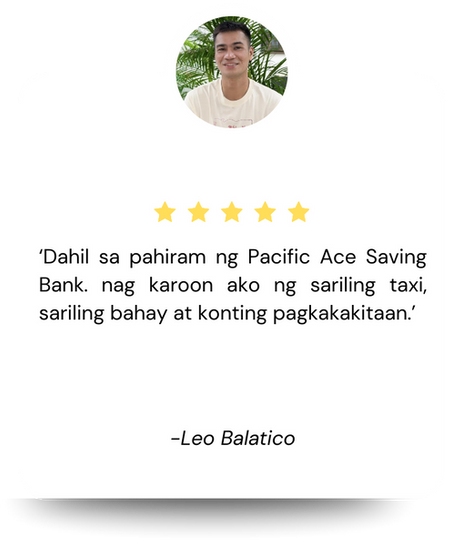 Pacific Ace Savings Bank offers a variety of loans for individuals, micro-entrepreneurs, and corporations. Our loans are tailored to meet your needs with flexible terms and competitive rates. Whether you need assistance with home renovations, education expenses, or business growth, we have the expertise and resources to help you succeed. Trust Pacific Ace Savings Bank for all your lending needs.